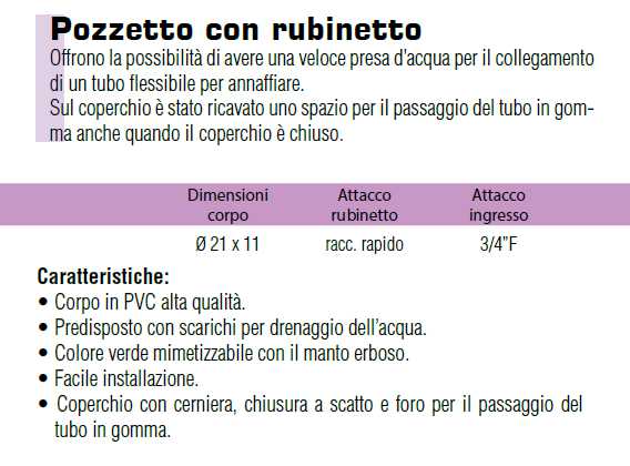 I pozzetti con rubinetto offrono la possibilità di avere una veloce presa d'acqua per il collegamento di un tubo flessibile per annaffiare