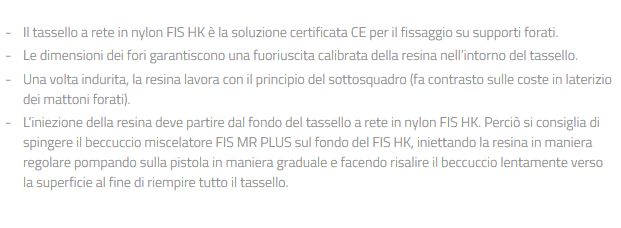La dimensione dei fori garantiscono una fuoriuscita calibrata della resina nell'intorno del tassello