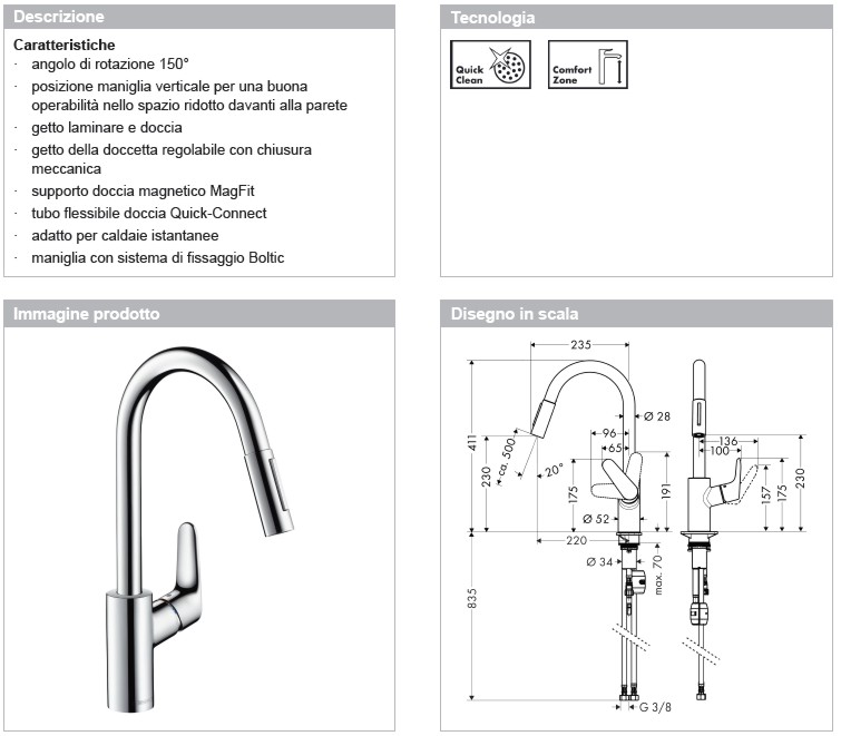 Posizione maniglia verticale per una buona operabilità nello spazio ridotto davanti alla parete, getto laminare e doccia