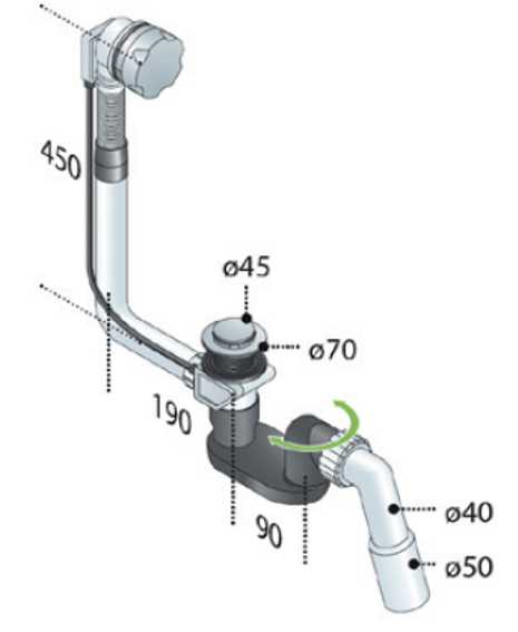 Comando a cavo inox, sifone pre-assemblato con codolo 45°, tappo D.45 in ottone, griglia tappo troppo pieno in metallo cromato